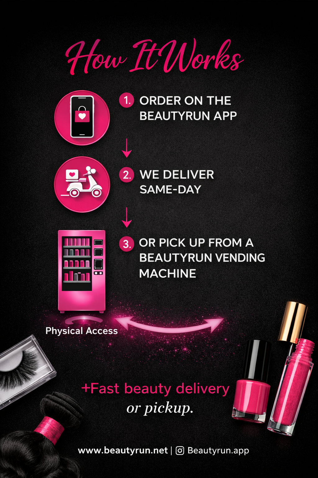 BeautyRun is a beauty convenience platform connecting customers to products through app ordering, vending access, and vendor partnerships.